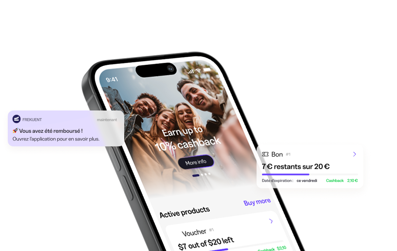 L'app Frekuent envoie des promotions, des offres groupées et des réductions directement à vos clients, le tout personnalisé avec vos couleurs et votre logo.